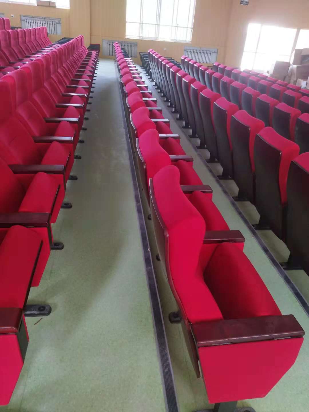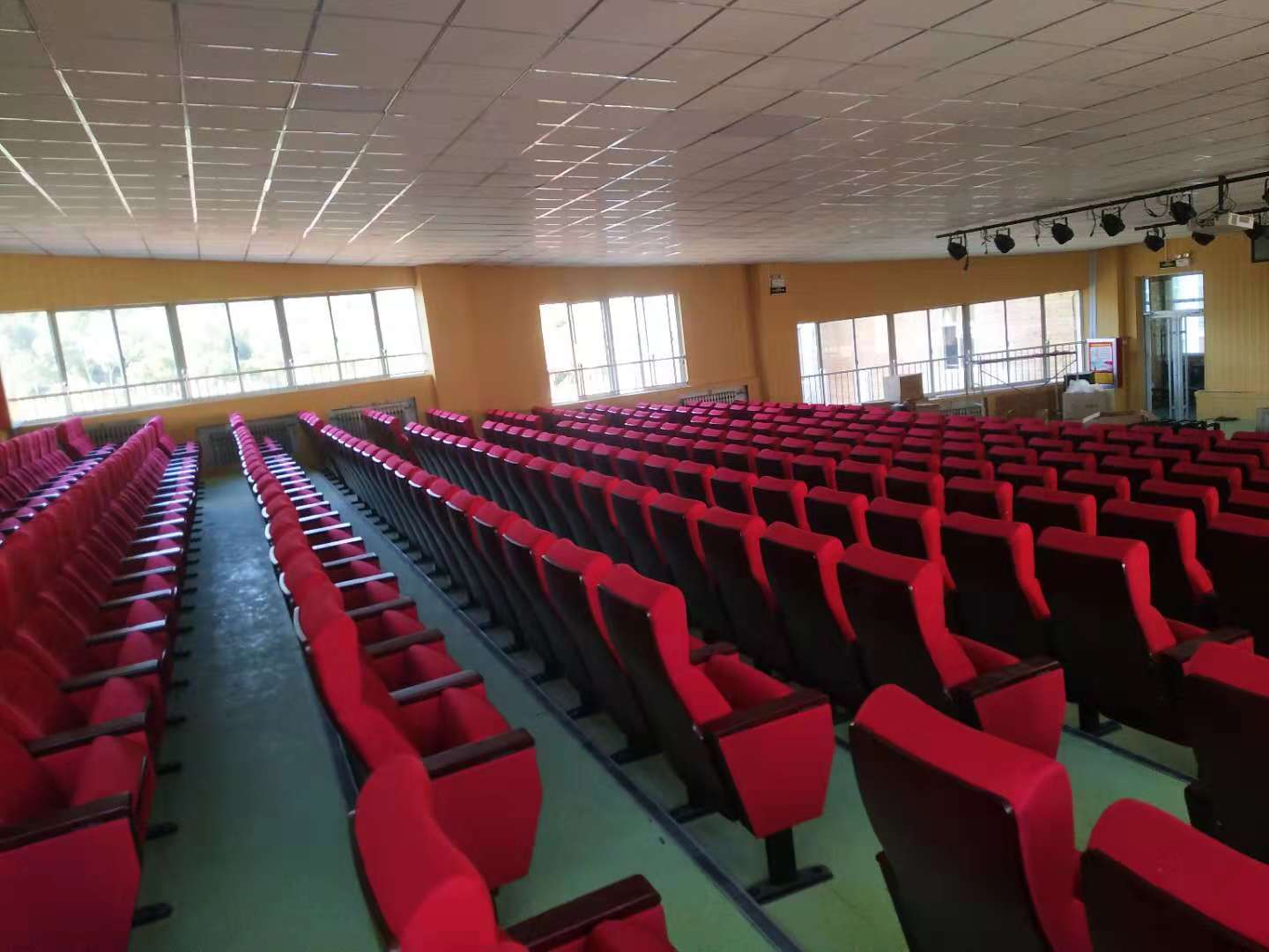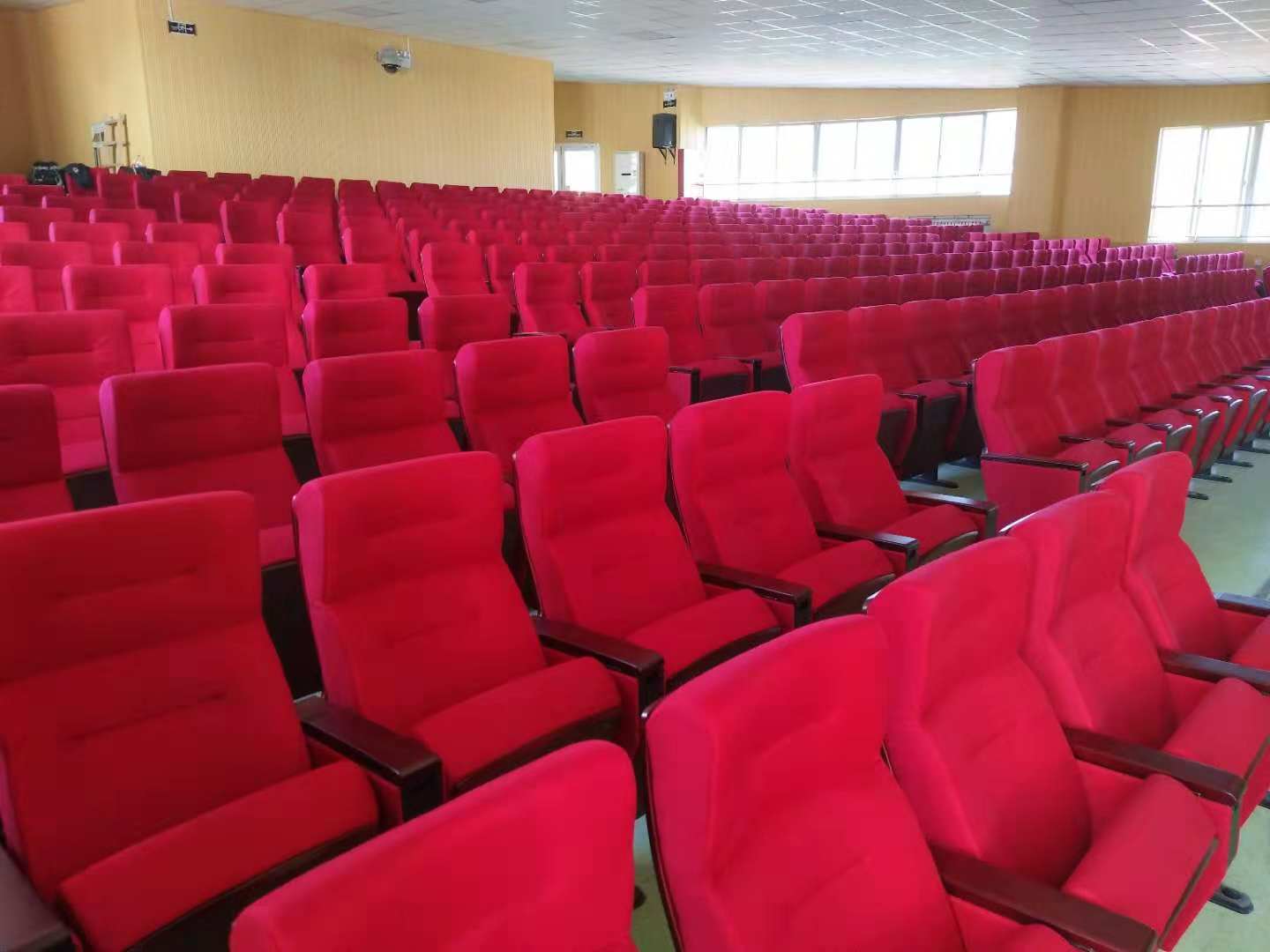 經過4天的努力山東省青島市珠江路小學禮堂報告廳的椅子終于完美竣工, 珠江路小學有學生三千多人,現在國家對教育的重視,對學校的軟件硬件的要求都提高很多,報告廳是學校的一個重要宣傳地方,平時學校組織的一些重要會議,文員演出等重要場所所以座椅也能太差,原來的椅子是硬板的,已經用了十年了,現在校長準備換成軟體沙發式的禮堂椅,這個會議室面積有三百多平方,把舞臺,過道去掉以后經過我們設計師的擺放最后確定375張座椅,剛開始我們單位以外小學應該用普通點座椅就可以,結果領導商量后決定用高檔次點的實木座背椅,領導重視椅子的質量和未來的服務,也對舒適都也再意最后挑選了我們中高檔次的座感舒適的帶頭枕座椅,合同簽訂后,十天發貨過去,我們施工隊經過四天的努力安裝完工,效果非常好,得到領導的一致肯定。